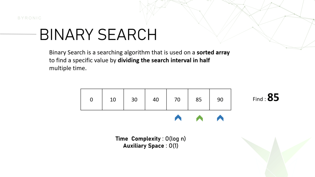 Binary Search is a searching algorithm that is used on a sorted array to find a specific value by dividing the search interval in half multiple time