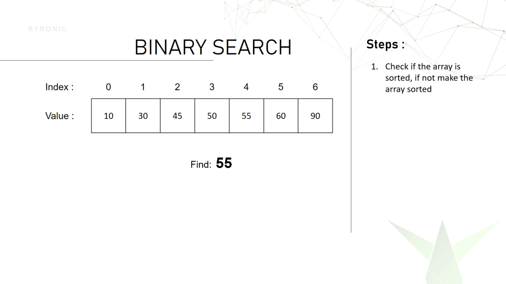 First we have to check if the array is sorted. Remember that this algorithm only works on sorted array. If they array is not sorted then we have to make the array sorted first.