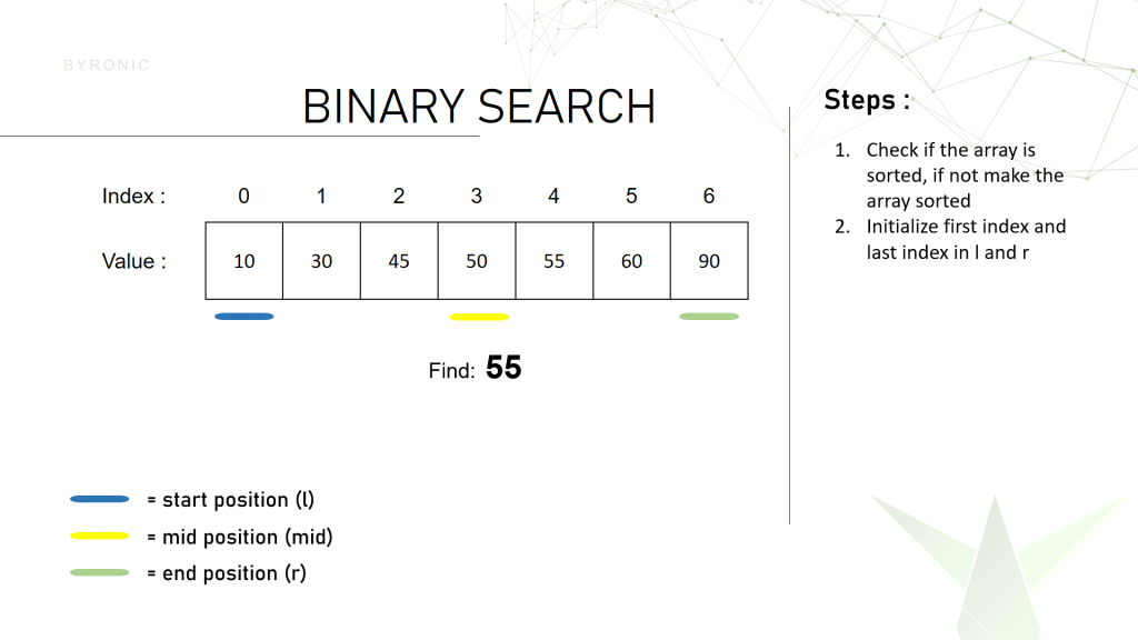 Let’s say we have this array of length 7 and index position starts from 0 to length-1 which is equal to 6. Here we have to find the number 55.